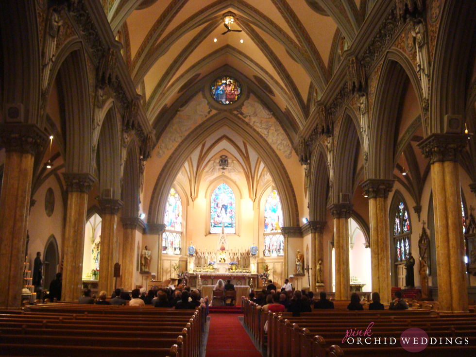 It was definitely a fun way to start the day! The bride and bridal party all got their hair and makeup done by Michelle DeVoe and her team from Demiche Beaute'. The bride's Monique Lhuillier dress was absolutely stunning with intricate applique flowers and beading on the top. The bride also wore shimmering gold Badgley Mischka shoes, and a cathedral length veil. The bridesmaids wore knee-length fuchsia Lazaro dresses, and carried bouquets of beautiful pale pink peonies.Sarah and Tommy opted to do a first look on the grand staircase with their photographer, Kate Femino of k.Photographie. Afterwards, they went to the Boston Public Garden for some portraits with the entire wedding party. This way, they could take a lot of photos prior to the ceremony so they could enjoy the cocktail hour with their guests later on.