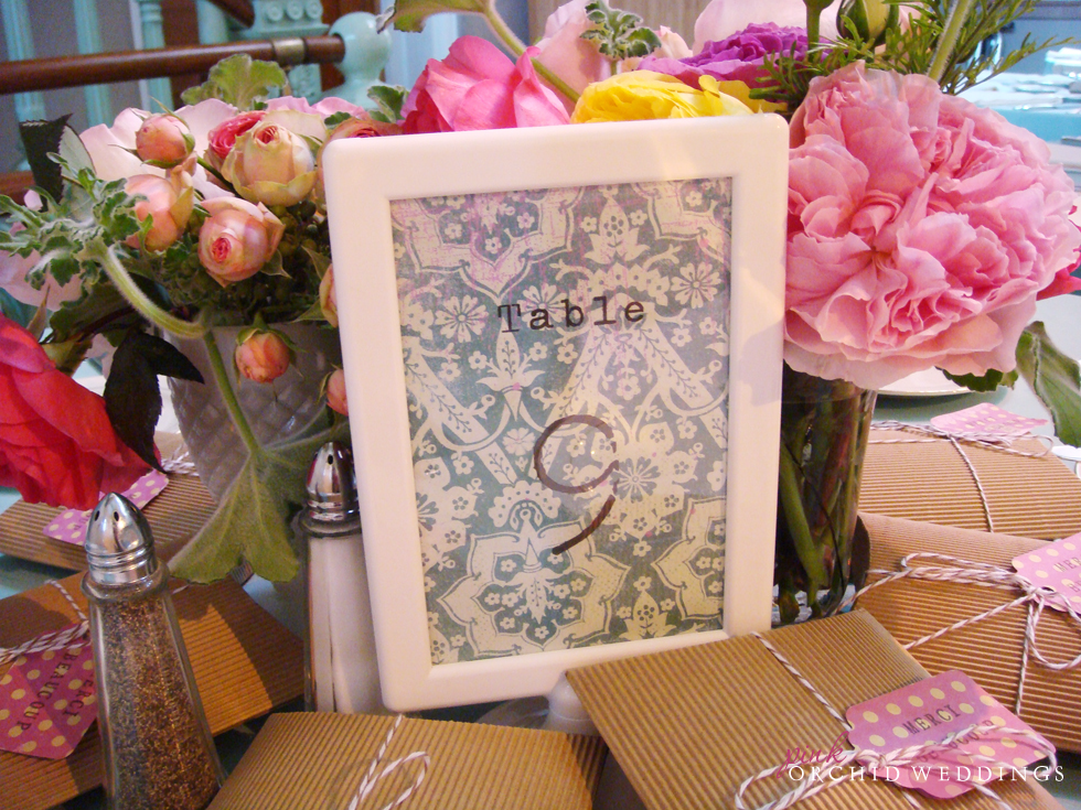The main theatre was transformed into an elegant reception after the ceremony, with gold chiavari chairs surrounding tables with sea foam green linens, and lush floral centerpieces in mercury glass, milk glass, and silver antique tea containers from Petalena. Guests found their names on an escort chart with hanging keys, and packaged cookie favors were set at each place setting. Colorful pennant flags were hung in strands on the wall and pinned into the front of the sweetheart table along with an antique lace runner from the bride.